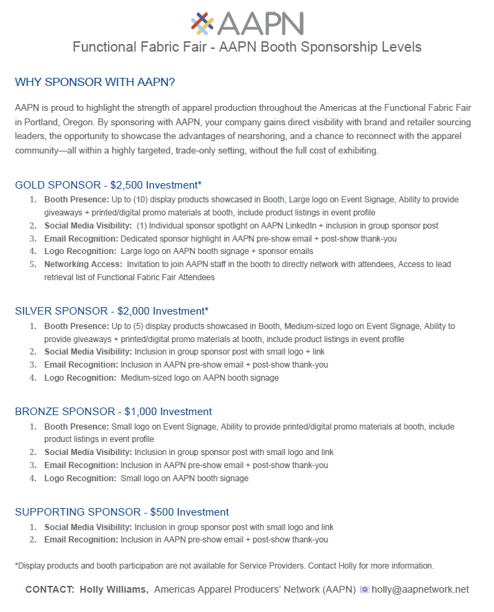 We are excited to exhibit at Functional Fabric Fair for the first time and invite you to join us by sponsoring the AAPN booth, purchasing your own exhibit booth or attending the show.